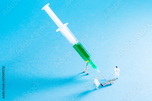 A miniature doctor and a nurse taking care of a patient who is in pain while a worker carrying a syringe to inject a substance