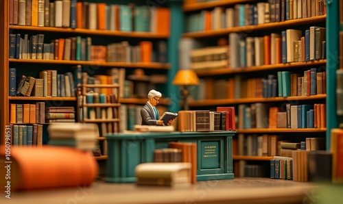 miniature, bookshelf, book, library, reading, figurine, model, desk, wooden, book, person, man, goggles, light, lamp, shelf, table, collection, wood, detail, hobby, craft, literature, cognition, education, brown, interior, home, cosy, vintage