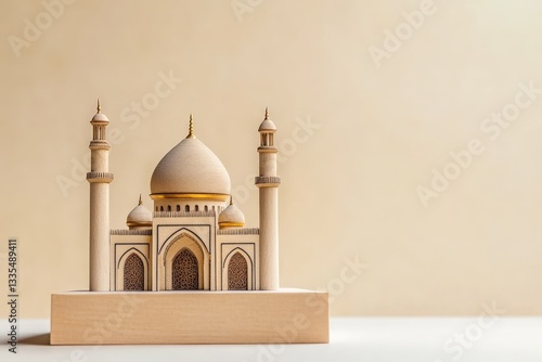 architecture, building, model, mosque, design, religion, islamic, structure, dome, tower, minaret, facades, arch, window, gold, ornament, miniature, wooden, detail, craft, artwork, symbol, construction, front, view, spiritual, place, faith, worship, pattern, symmetry, style, elegant, decorative, beige, neutral, background, colours, light, shadow, shape, composition, sharpened, studio, render, tabletop, minimal