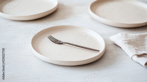 A minimal arrangement of pale beige plates, a single flat fork, and a natural linen napkin on a clean wooden table