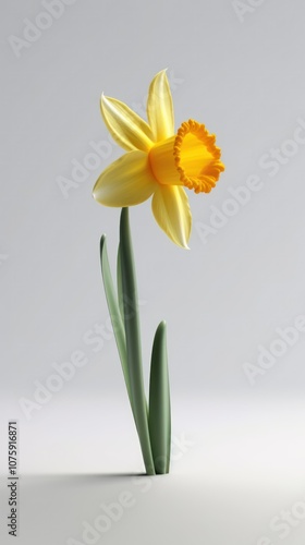 A minimalist 3D rendering of a single daffodil, with vibrant yellow petals and a soft white background.