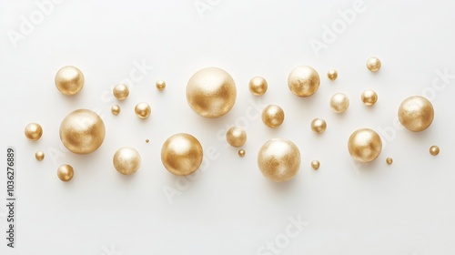 A minimalist arrangement of golden baubles of different sizes, scattered across a white background, their surfaces reflecting soft, ambient light.