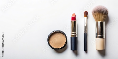 make-up, cosmetic, beauty, powder, lipstick, brush, foundation, compact, red, brush, tool, simple, minimalist, white background, arrangement, aligned, neat, essential, elegance, skincare, face