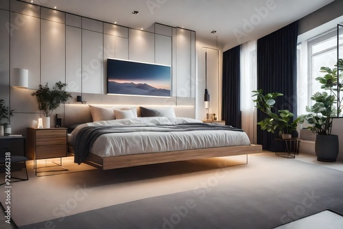 A minimalist bedroom has a comfortable bed and soothing ambient lighting.