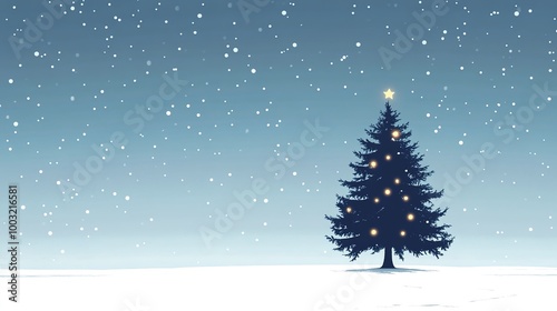 A minimalist Christmas tree silhouette against a snowy landscape, with just a few twinkling lights to add a touch of festivity