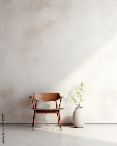 A minimalist concept featuring a chair and plant positioned in front of a wall.