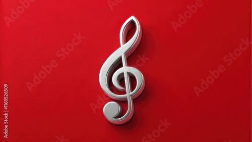 A minimalist design featuring a silver treble clef symbol against a vibrant red background.