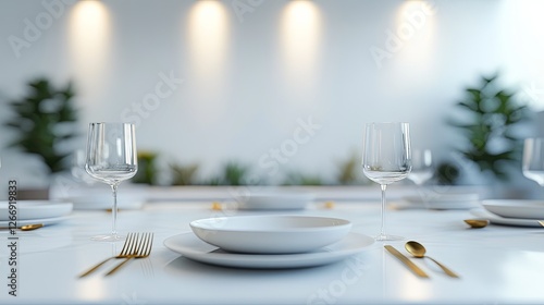 A minimalist dining setup with clean white plates and subtle gold accents. digital