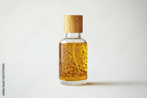 A minimalist glass bottle filled with golden liquid and a bamboo lid, presented against a clean white backdrop, conveying natural beauty, elegance, and simplicity of design.