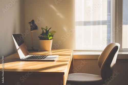 A minimalist office workspace with a single wooden desk, an ergonomic chair, a MacBook, and a small potted plant, bathed in soft daylight
