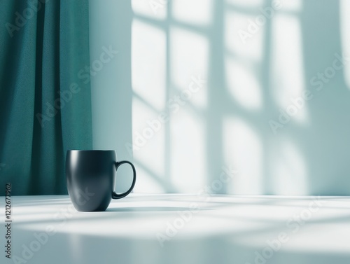 A minimalist scene featuring a black mug casting shadows on a bright surface, complemented by soft green curtains.