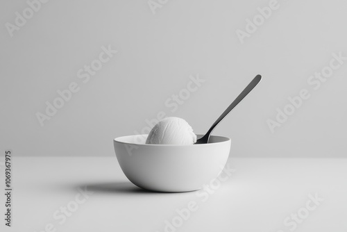 A minimalist shot of a single vanilla ice cream scoop in a plain white bowl with a silver spoon.