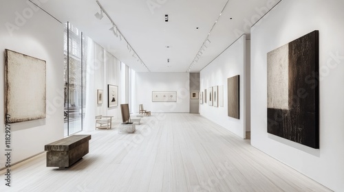 A minimalist white art gallery featuring modern decor and elegant art displays, creating a clean and sophisticated atmosphere.