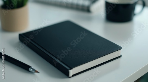 notebook, pen, desk, plant, cup, black, white, paper, stationery, writing, surface, office, workspace, minimalist, study, education, professional, simple, clean, aesthetic, closeup, background, tool, equipment, journal, composition, design, modern, decor, item, leather, table, utensil, home, interior, accessory, artistic, office supply