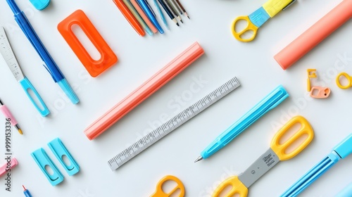 A minimalistic flat lay of colorful office supplies, including scissors, a ruler, and markers, spread out on a white surface.