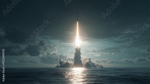 A missile launches from the open sea, creating a dramatic plume of smoke and fire, symbolizing military power and strategic defense.