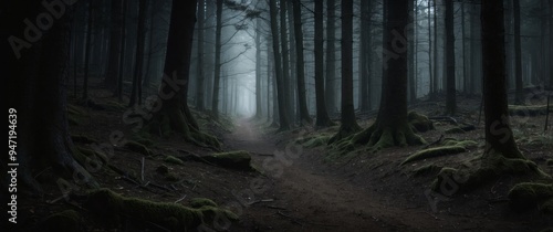 forest, tree, path, mist, fog, dark, moody, root, branch, nature, timberland, green, mossy, ground, dirt, atmosphere, mystical, shadowy, light, deep, tall, dense, wilderness, scene, landscape, aethereal, mysterious, secluded, calmness, serenity, overgrown, perspective, sunlight
