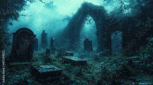cemetery, gravestone, mist, arch, ruin, ivy, nature, decay, eerie, tree, shadow, fog, stone, history, landscape, silence, haunting, forgotten, atmosphere, abandoned, vegetation, dark, mysterious, serenity, old, crypt, burial, path, tranquil, overgrowth, solitude, weathered, relic, grave, spiritual, remnant, twilight, ancient, beauty, sombre, memorial, time, peace, stillness, depth, exploration, heritage