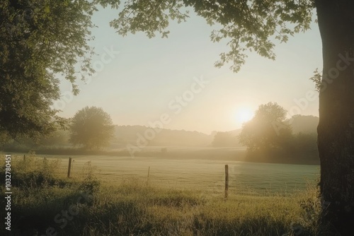 sunrise, mist, field, tree, grass, fog, sky, morning, gold, light, warm, peaceful, serene, nature, landscape, horizon, sun, beam, ray, soft, glow, hazy, aethereal, quiet, tranquil, calm, outdoors, beauty, fence, post, rural, farm, green, brown, yellow, silhouette, shadow, distant, lush, vibrant