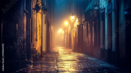 A misty urban alley at night, illuminated by street lights, showcasing a mysterious ambiance on a dark background