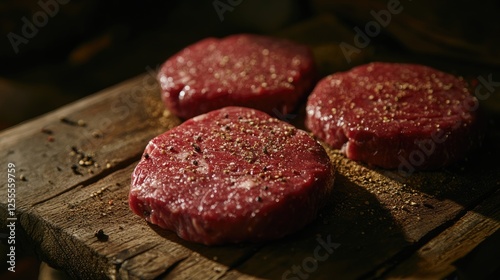 A mix of raw beef steaks, dry-aged cuts, and hamburger patties on a wooden surface with seasoning, ready for grilling