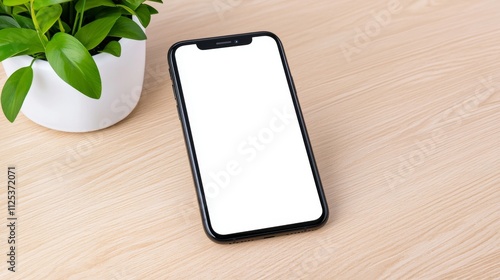 A mobile phone mockup in isometric view, placed on a white table with a blank chat or messenger interface. The screen shows template talk bubbles, illustrating social internet communication on a