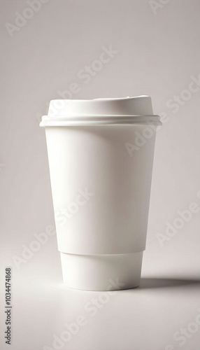 A mockup image of a paper cup with a cap on a clean, minimalist background, ideal for showcasing branding designs or marketing campaigns for beverages.