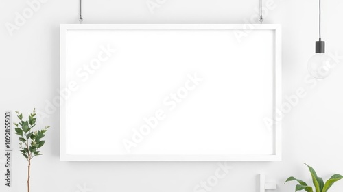A mockup of a hanging poster with a white frame against a light grey wall, white frame, interior design, concept