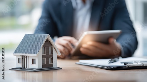 A model house sits on a desk while a person uses a tablet, suggesting a focus on real estate or property management.