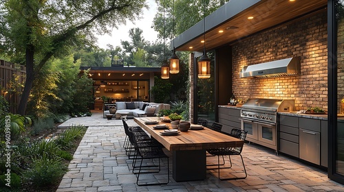A modern alfresco dining space with stone paver flooring, a sleek wooden dining table set for a family meal, an outdoor kitchen with stainless steel appliances,
