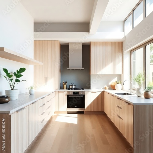 a modern and minimalist kitchen characterized by clean lines and a bright, airy atmosphere. Cabinetry. Countertop. Sink Area. Appliances. Natural Light. Flooring. Greenery.