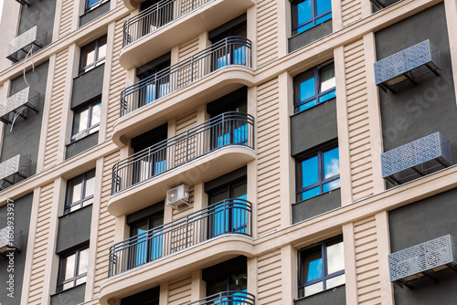 A modern apartment building with balconies, metal railings, air conditioners and decorative elements. The facade is made in light and dark colors.