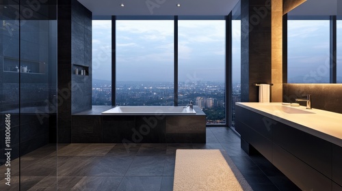 A modern bathroom featuring large windows with a stunning city view, sleek fixtures, and a minimalist design, creating a serene and luxurious atmosphere.