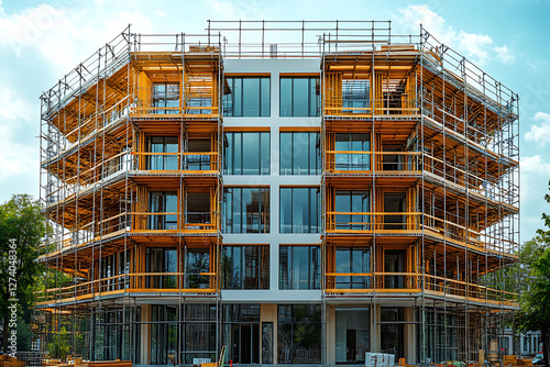 A modern building under construction with scaffolding surrounding the structure, illuminated by bright sunlight. The image represents real estate development, construction industry, and architectural