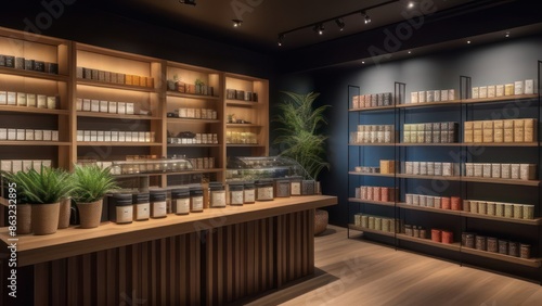 A modern, chic tea shop interior with an array of tea products elegantly displayed on wooden shelves.