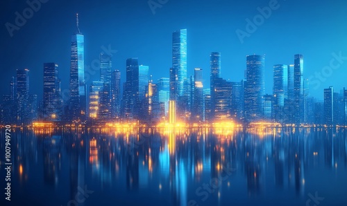 A modern city skyline at night, with skyscrapers illuminated against a dark blue sky, reflecting in the water below.