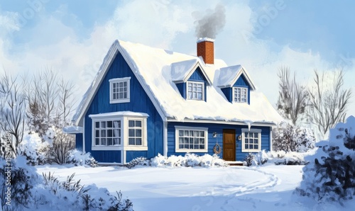 a modern classic-style small house with blue-colored walls and a white roof in winter.