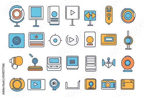 A modern collection of clean outline icons representing audio and video.