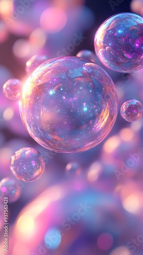 A modern design featuring iridescent 3D spheres with geometric bubble patterns in soft pastel colors.