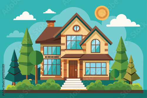 A modern flat house with large windows stands among lush trees and whimsical clouds under a bright sun, Select house Customizable Flat Illustration