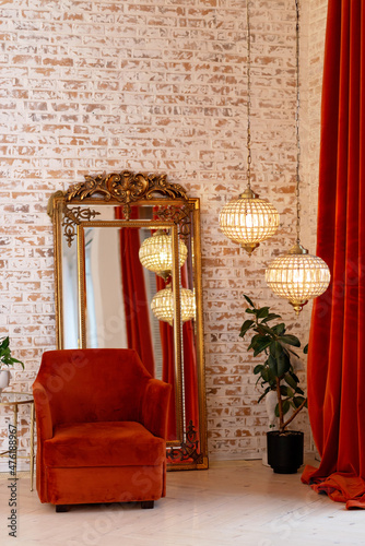 A modern French interior with corduroy burgundy curtains, an armchair, a vintage growth golden mirror and crystal chandeliers against a brick wall. Soft selective focus.