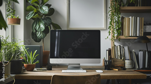 home office, computer, houseplant, workspace, modern, desk, plant, peaceful, office, decor, contemporary, design, organised, technology, monitor, keyboard, mouse, productivity, greenery, interior, stylish, comfortable, creative, book, shelf, elegant, tranquil