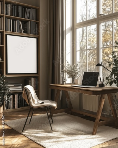 A modern home office with a blank poster frame on the wall, featuring a minimalist interior design style