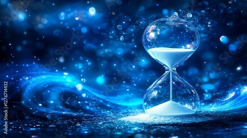 A modern, intricate illustration of an hourglass with a transparent glass flask and white sand, positioned against a blue background. Ideal for use in design templates and layouts