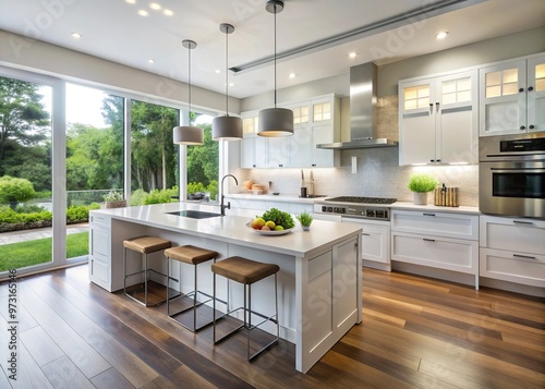 A modern kitchen interior boasts white cabinetry, sleek countertops, and ample natural lighting, creating a bright and airy space perfect for cooking and entertaining.