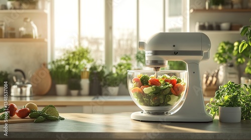kitchen, modern, white, vegetable, green, garlic, herb, fresh, glasses, window, natural, light, plant, bright, style, soft, lighting, photorealistic, cooking, culinary, healthy, organic, nourishment, diet, contemporary, clean, roomy, airy, functional, greenery, vibrant, wholesome, appetising, preparation, food, counter, stylish, inviting