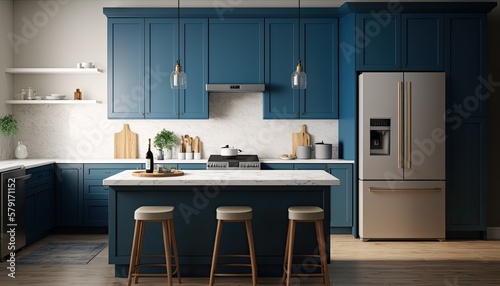 A modern kitchen with sleek blue cabinets and marble countertops, complete with stainless steel appliances and a central island for cooking and entertaining. generative ai