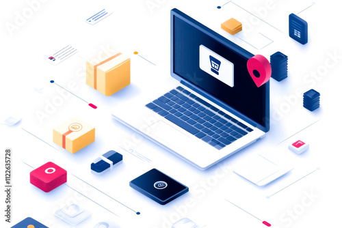 A modern laptop surrounded by various digital icons and packages, symbolizing e-commerce, technology, and data management.