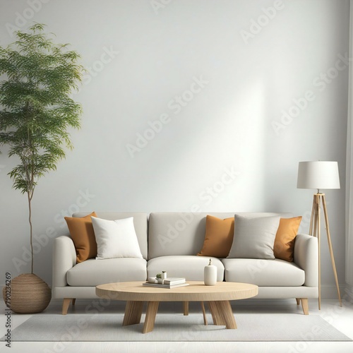 A modern living room featuring a white sofa with orange and white cushions, a wooden coffee table, a floor lamp, and a decorative plant in a corner.