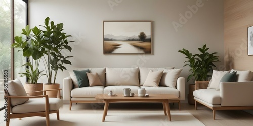A modern living room with a large beige sofa, a wooden coffee table, and a landscape painting on the wall. The room has a minimalist and cozy feel